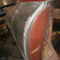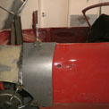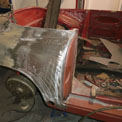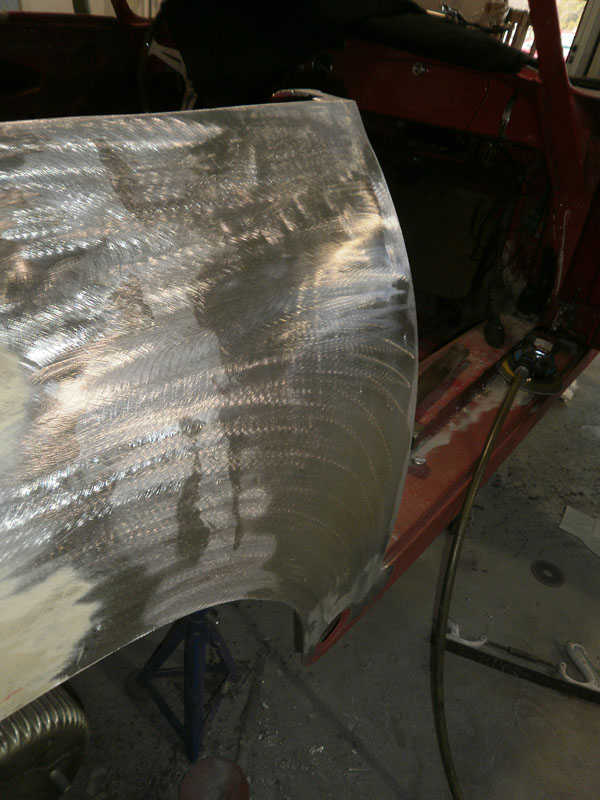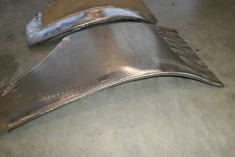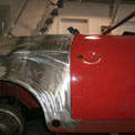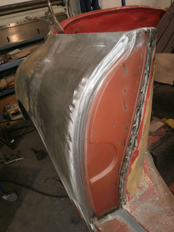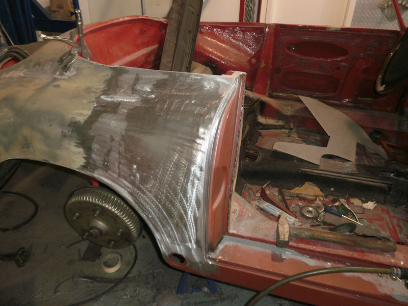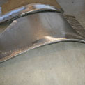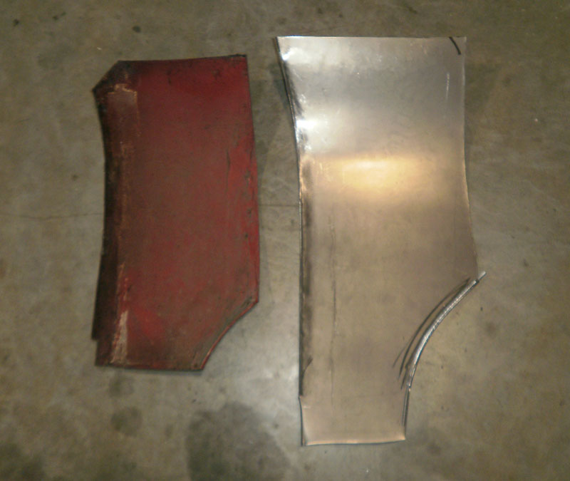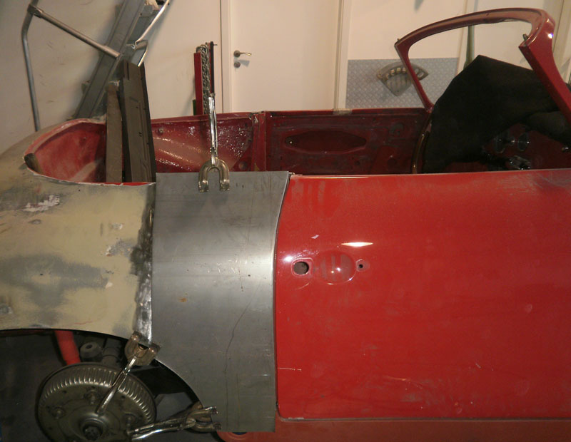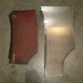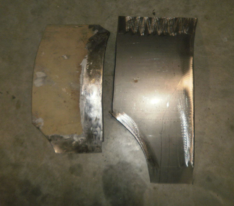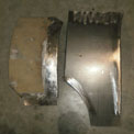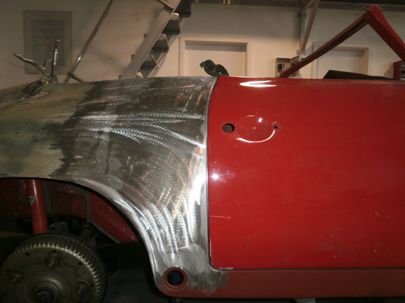 Hier sieht man das Formes des neuen Radlaufes. Anschliessend das Ergebnis nach dem einschweissen, und schliesslich nach dem verzinnen und schleifen. Das letzte Bild zeigt das optimale Spaltmass zur originalen Türe.