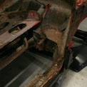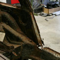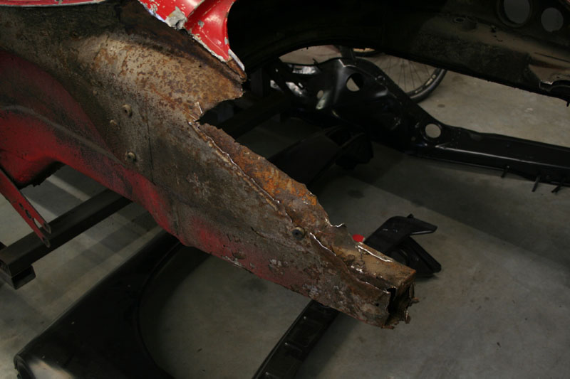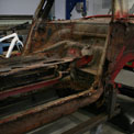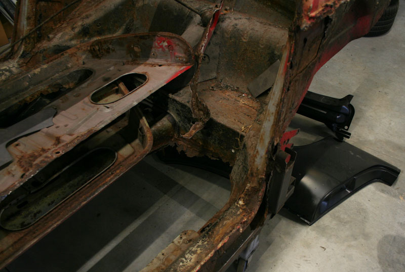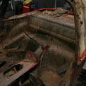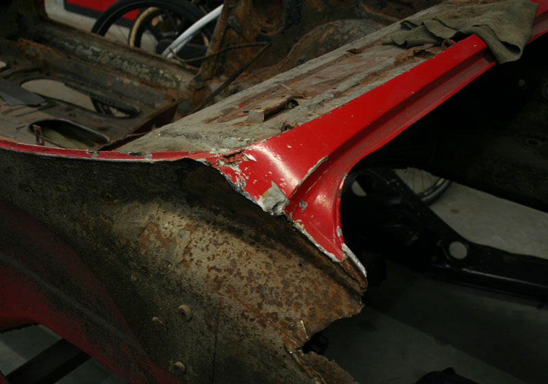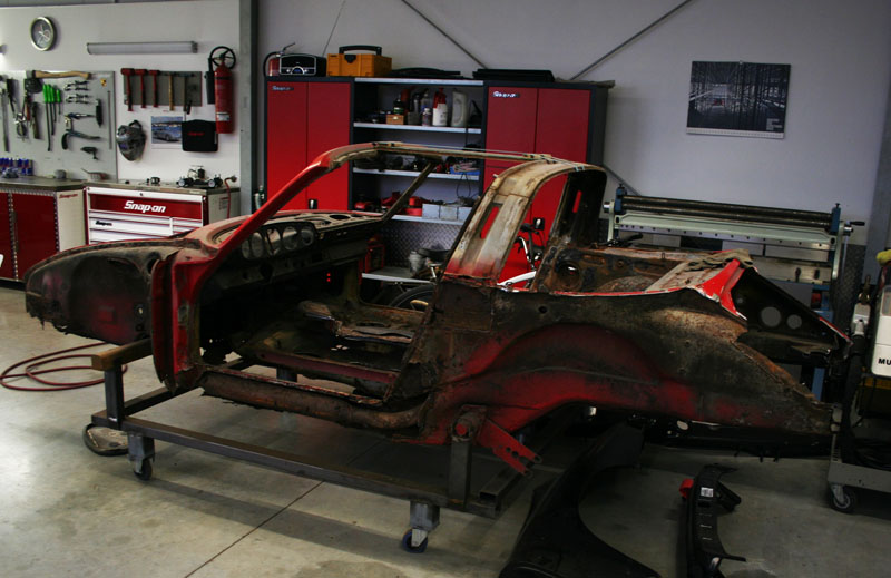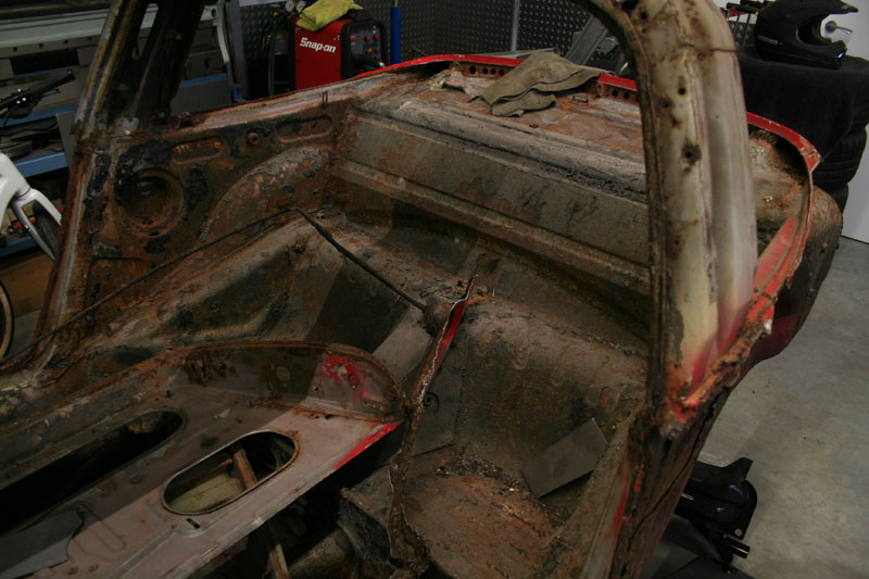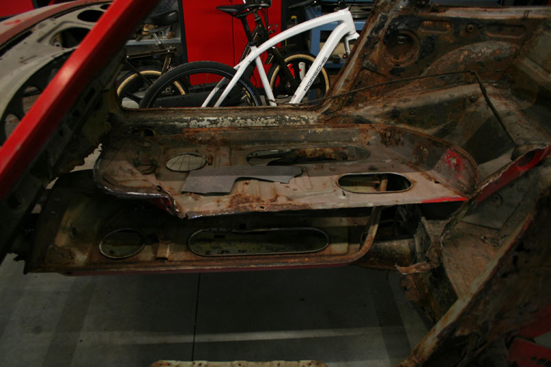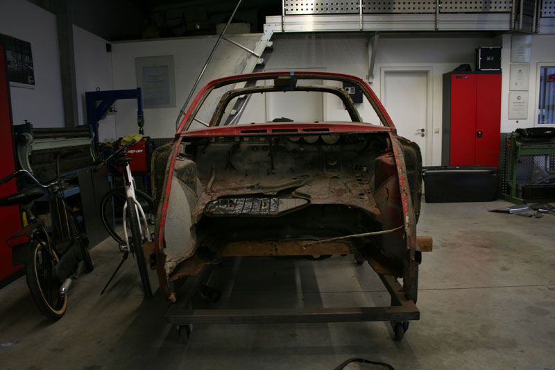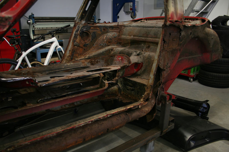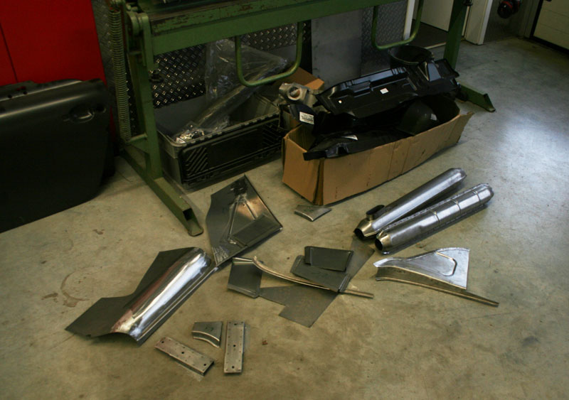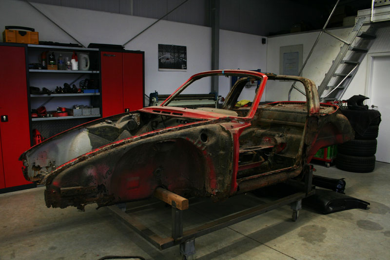 Von diesem 911er Targa, der in einem ziemlich schlechten Gesamtzustand ist, gibt es werkseitig nur die äusseren Karosseriebleche wie Seitenteile, Aussenhaut der Türen etc.